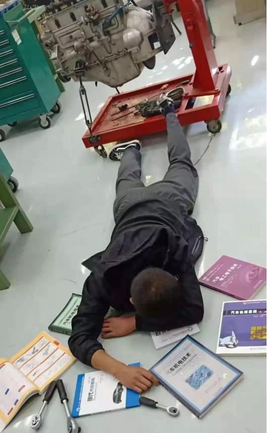 摔了,摔了,一位汽车工程系的小饺子在实训室不慎摔倒,手边还放着实训工具,看出他对汽车专业知识的渴望。