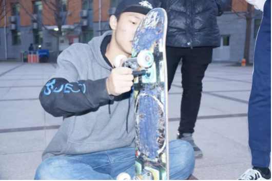 为了在校园里推广滑板运动,孙佳鹏和队员们一直在努力尝试。“我们想把最基本的知识传递给喜欢滑板的人,让大家了解滑板文化,学会简单的板上动作,甚至知道组装滑板的简单手法。” 采访中, 主动为我们演示了滑板零件的检测与组装。