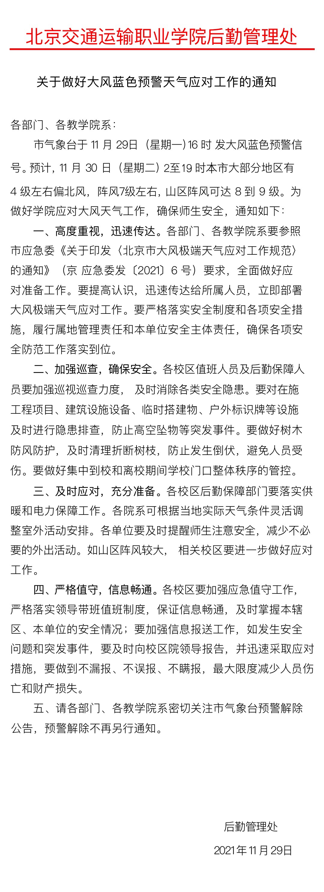 关于做好大风蓝色预警天气应对工作的通知(2021-11-29)