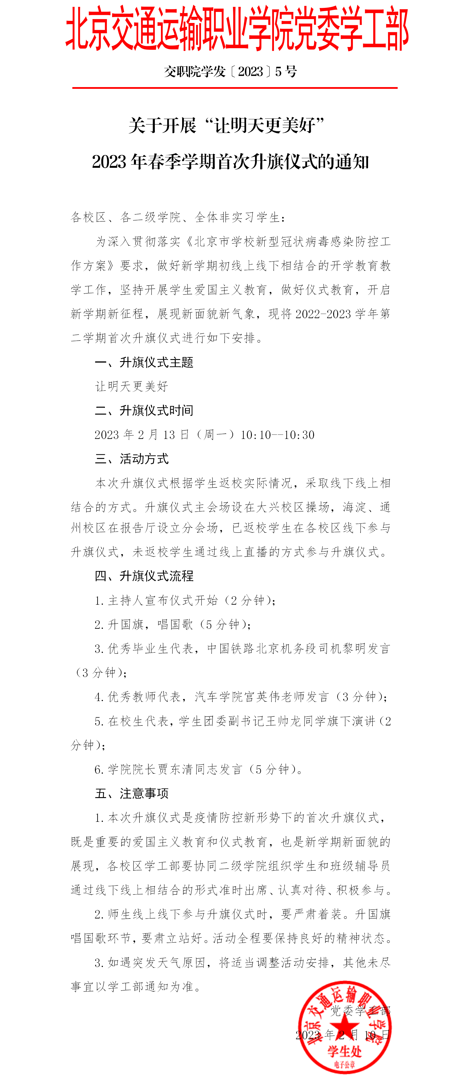 关于组织开展“让明天更美好”2023年春季学期首次升旗仪式的通知
