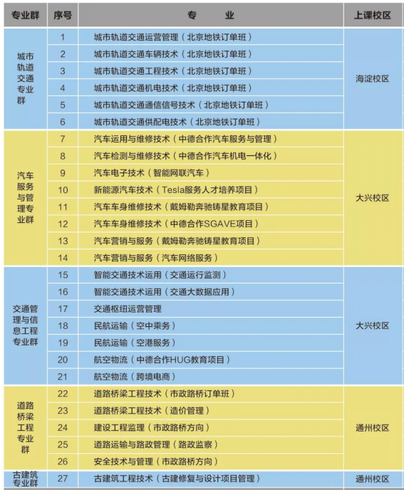 城市轨道交通专业群、汽车服务与管理专业群、交通管理与信息工程专业群、道路桥梁工程专业群、古建筑专业群