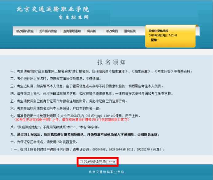 认真阅读完招生须知后,勾选我已阅读并点击下一步,开始填报信息。