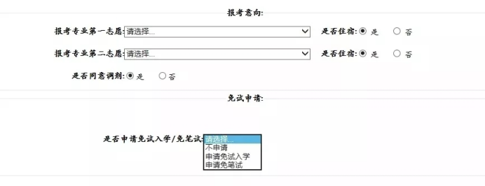 填报志愿(每名考生可以选择”两个志愿专业”)并且选择是否服从调剂,有免试入学或免笔试资格的考生根据自身条件选择相应选项,并填写证明材料名称。