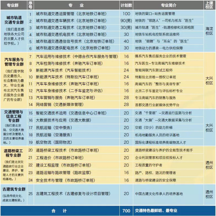 ——我院2018年录取率为100%,并且全部录至学生报考的第一志愿专业,欢迎对城市轨道交通专业群、汽车服务与管理专业群、交通管理与信息工程专业群、道路桥梁工程专业群、古建筑专业群各专业感兴趣的学生报考我院。我们很优秀,并且不难考。
