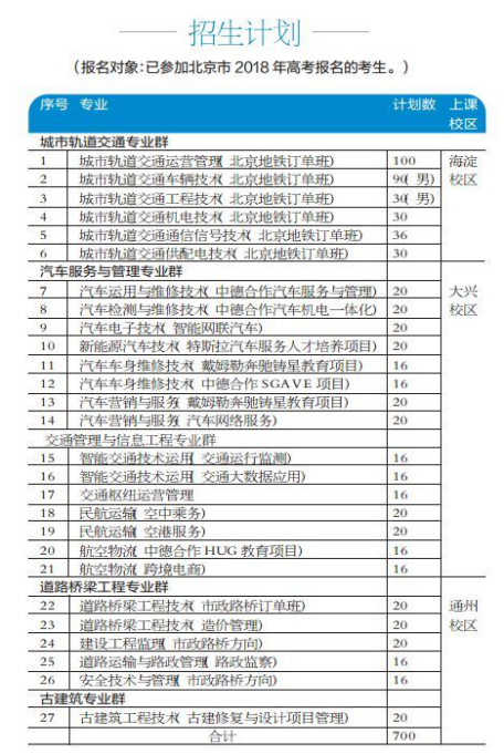 学院今年自主招生有700人计划,27个专业。涉及城市轨道交通专业群、汽车服务与管理专业群、交通管理与信息工程专业群、道路桥梁工程专业群和古建筑专业群等五大专业群,共涉及20多个专业,就业岗位覆盖交通行业主要领域和部门。学院专注交通行业,所以在交通领域就更专业。