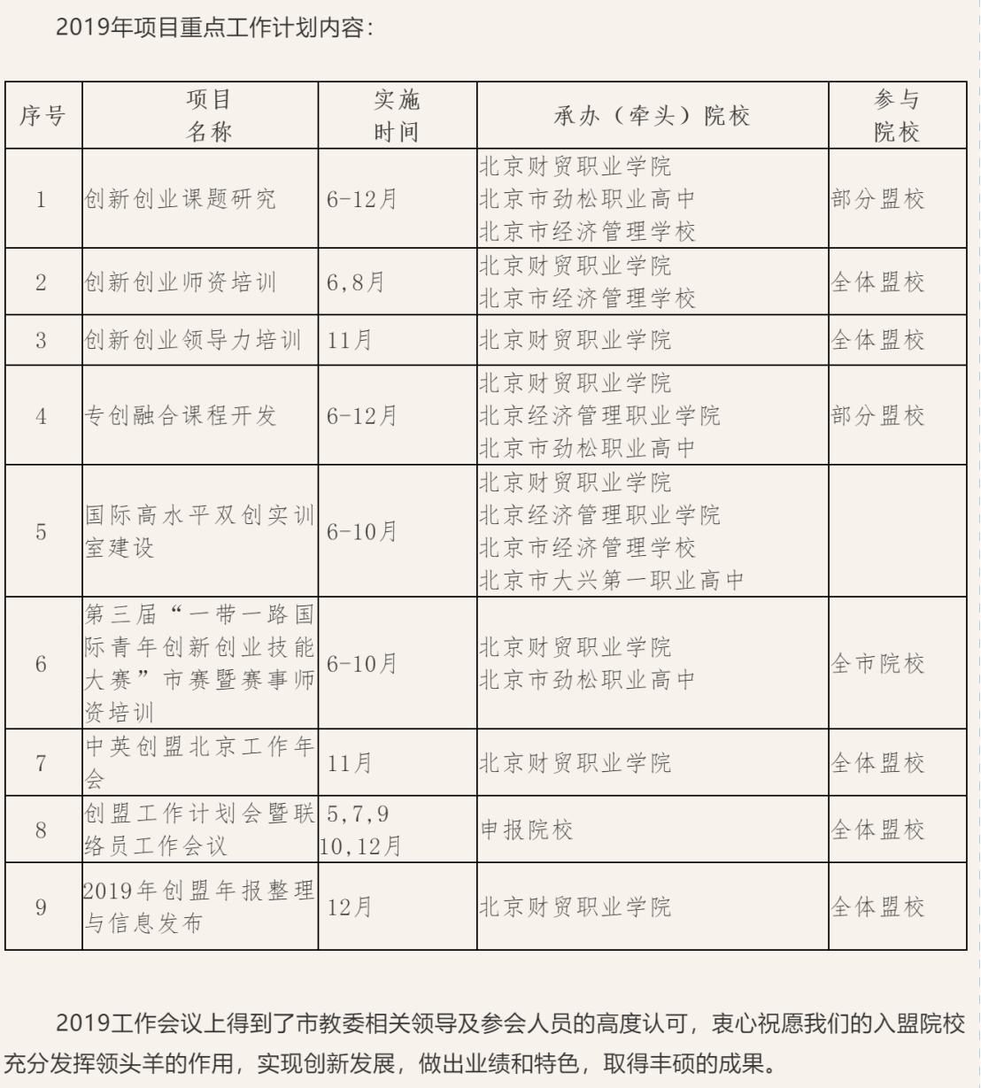 中英创盟北京英方秘书长 NCEE(China) CEO王啸宇做了2019年项目工作计划部署。围绕办好“两个事”,落实国务院、教育部、北京市的职教国际化升级需求,详述了中英创盟北京2019 年工作重点:1、深化以“一带一路国际青年创新创业技能大赛”为抓手“走出去” 打造职业教育国际化新标杆、示范,深化扩大北京品牌项目,讲好北京故事。2、深化以双创教育人才培养改革试点“引进来”。