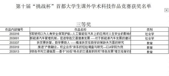 思政部思想会客室在第十届“挑战杯”首都大学生课外学术科技作品竞赛中,陈慧老师指导的6个参赛作品,5个获得北京市三等奖奖项。学院荣获第十届“挑战杯”首都大学生课外学术科技作品竞赛“优胜杯”奖项。为我院在首都大学生挑战杯大赛中带来新的突破。