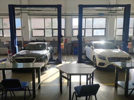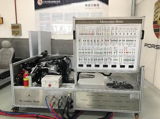 目前实训基地分为发动机总成实训区域、自动变速器实训区域、发动机故障诊断实训区域、车身电气实训区域及整车实训区域。并且配备奔驰的诊断仪和WIS奔驰车间维修信息系统。实训教学资源能够满足教学大纲规定7个学习领域的教学需求。