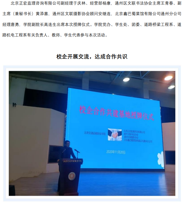 高连生副院长代表学院向四家校企合作共建育人基地单位代表授牌。学院将与各 单位在实习、礼仪文化、艺术创造等方面开展深入、全面的合作,创新校企合作模式, 培育德智体美劳全面发展的综合型人才。