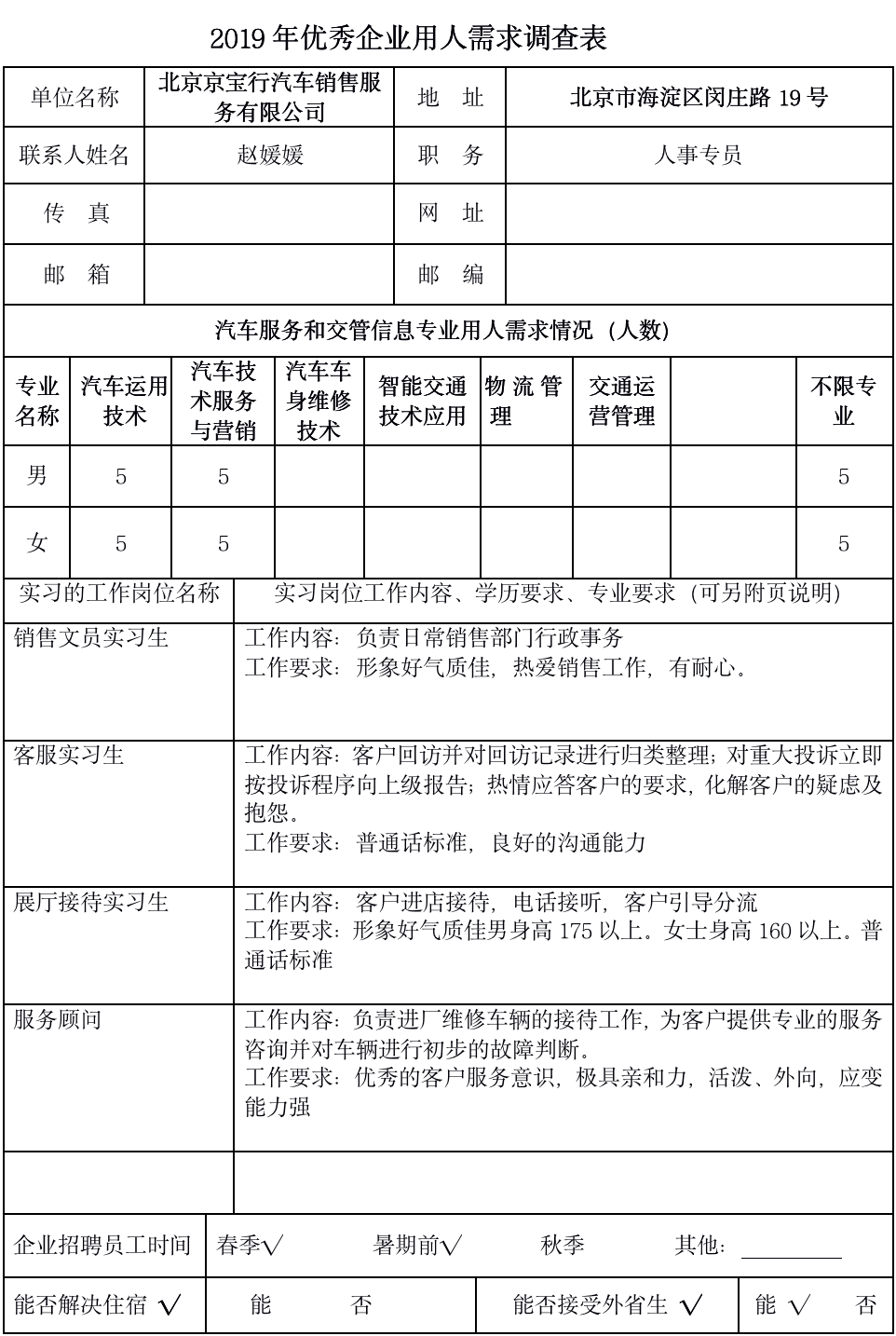 北京京宝行汽车公司2019年企业需求