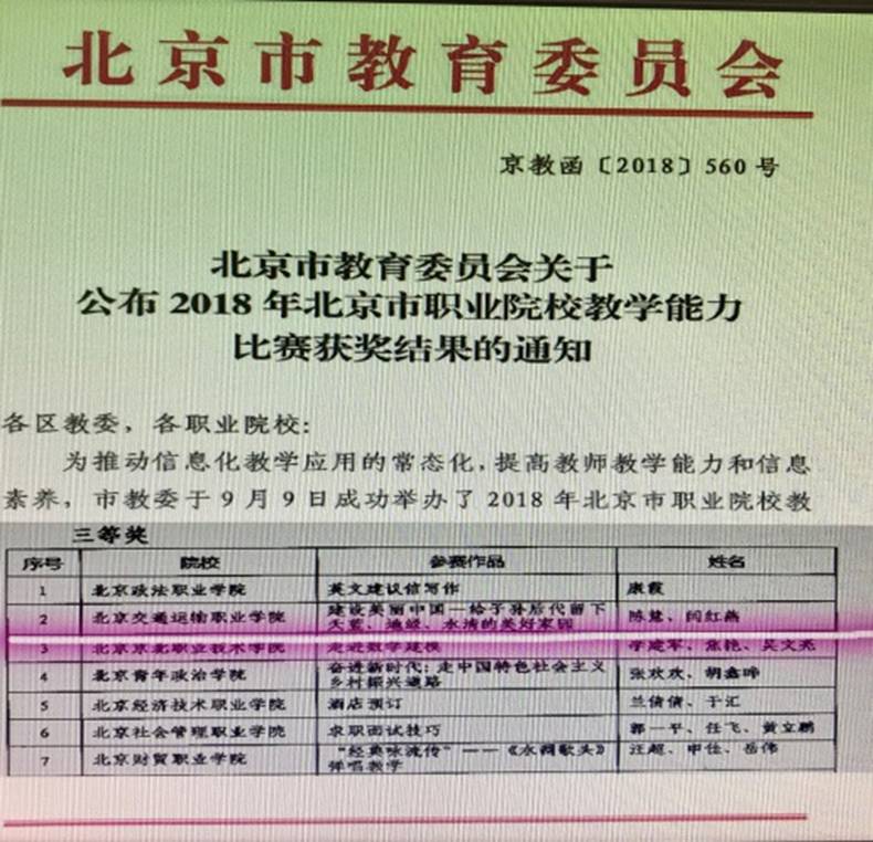 陈慧、闫红燕老师在北京市教委组织的职业院校教学能力比赛中获得三等奖