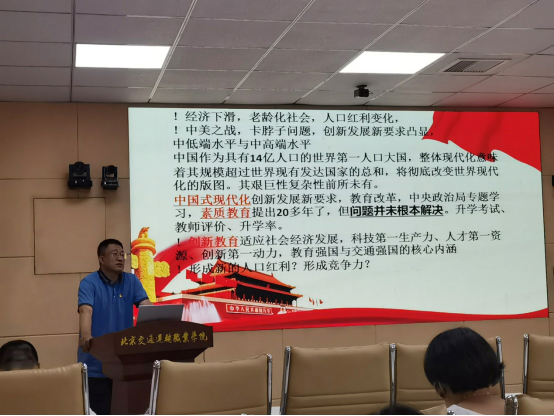 6月25日,道路桥梁学院党支部组织开展党委委员讲专题党课。学院党委委员、副院长高连生同志讲授以“中国式现代化新发展形势下职业教育改革创新发展新要求”为主题的专题党课。本次党课紧紧围绕经济发展形势、国际发展环境,中国式现代化新要求;职业教育改革适应新阶段新发展要求的新内涵;目前工作的新要求三个方面展开。通过聆听党课,党支部全体党员明确了在中国式现代化创新发展新要求的背景下,作为职业院校的一名党员教师,要围绕“思政”“专业”“创新”三个核心内涵,融合教育培养“全过程”“全方位”“全体学生”的理念,提升专业鲜明度和贡献度,打造有创新性的工作任务模块化体系,构建结构化师资体系,从而更好地为学院未来的建设发展贡献自己的力量。