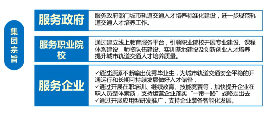 全国城市轨道交通职业教育集团立足于推进我国城市轨道交通行业持续健康发展,构建城市轨道交通职业教育生态环境,建立城市轨道交通行业参与者之间的有效连接,搭建产、学、研、用的合作平台,将更好地满足城市轨道交通行业快速发展对人才、技术、管理等多方面的需求,进一步规范、提升城市轨道交通人才培养工作。