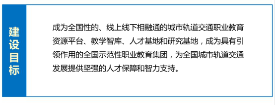 通过建立线上线下相结合的教育服务平台,帮助职业院校开展专业建设、课程体系建设、师资队伍建设、实训基地建设及创新创业人才培养,提升城市轨道交通人才培养质量。依托已经建立的城市轨道交通专业国家级教学资源库,帮助职业院校形成对接职业标准、行业标准和岗位规范,紧贴实际工作过程的课程体系。未来将面向职教集团成员单位、教师、学习者提供在线教学、培训服务。