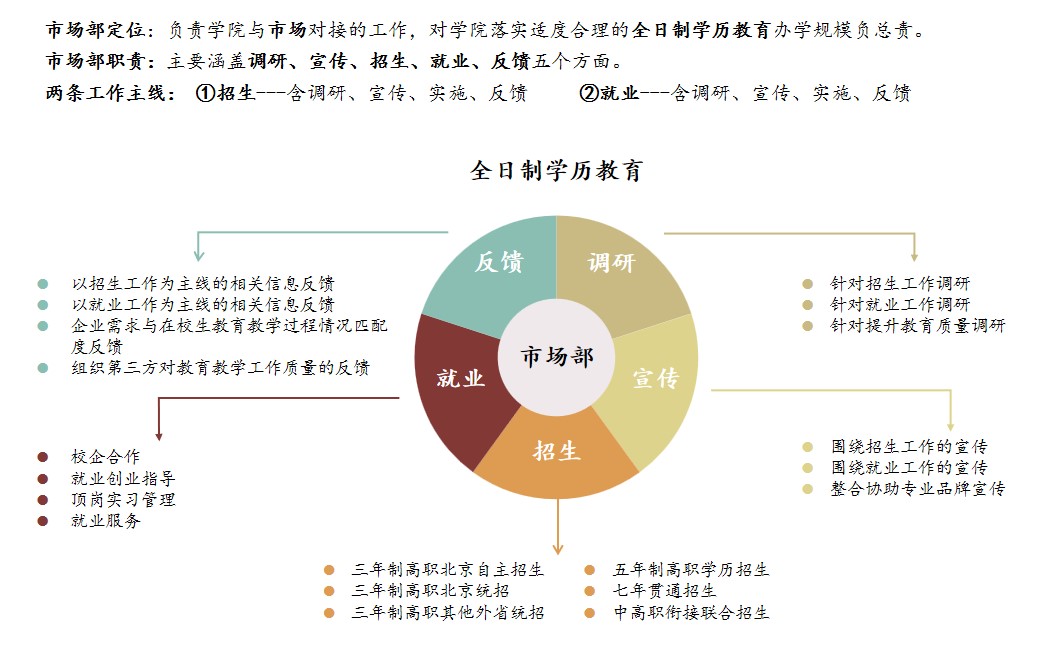 市场部定位:负责学院与市场对接的工作,对学院落实适度合理的全日制学历教育办学规模负总责。 市场部职责:主要涵盖调研、宣传、招生、就业、反馈五个方面。 联系电话:(010)69241644-8011