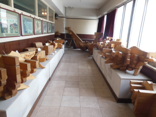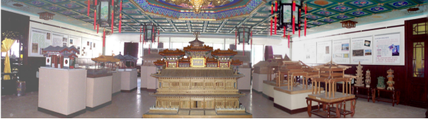 《中国古建筑实训室》根据中国传统建筑岗位,划分为雕刻室、木作室、瓦作室、彩画室、斗拱室、综合室等区域,各个实训室内既展示了古建构件的模型,也突出表现了古建关键岗位的操作技能与操作程序。学生既可以参观临摹,也可以实际操作,是中国传统建筑技艺的综合体现。
